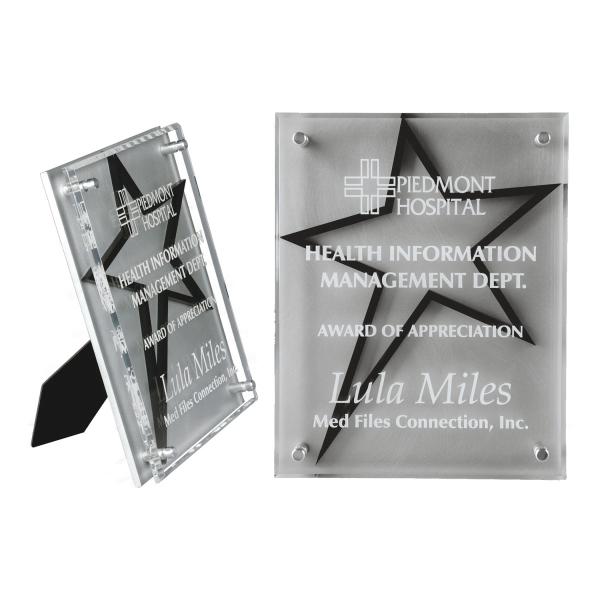 Presenting an acrylic stand-out plaque that boasts a black acrylic back painted with a brushed silver pattern. Brushed aluminum stand-offs securely fasten the top acrylic layer. The award features a black acrylic star placed between the layers. Our laser engraving option offers a frosted look and excellent contrast, while the full-color printing option adds a vibrant touch to your artwork. The acrylic award is a perfect way to acknowledge and appreciate the hard work and dedication of an outstanding employee, a top-performing student, or an exceptional team. It is an excellent choice to recognize someone who deserves to be honored and appreciated.